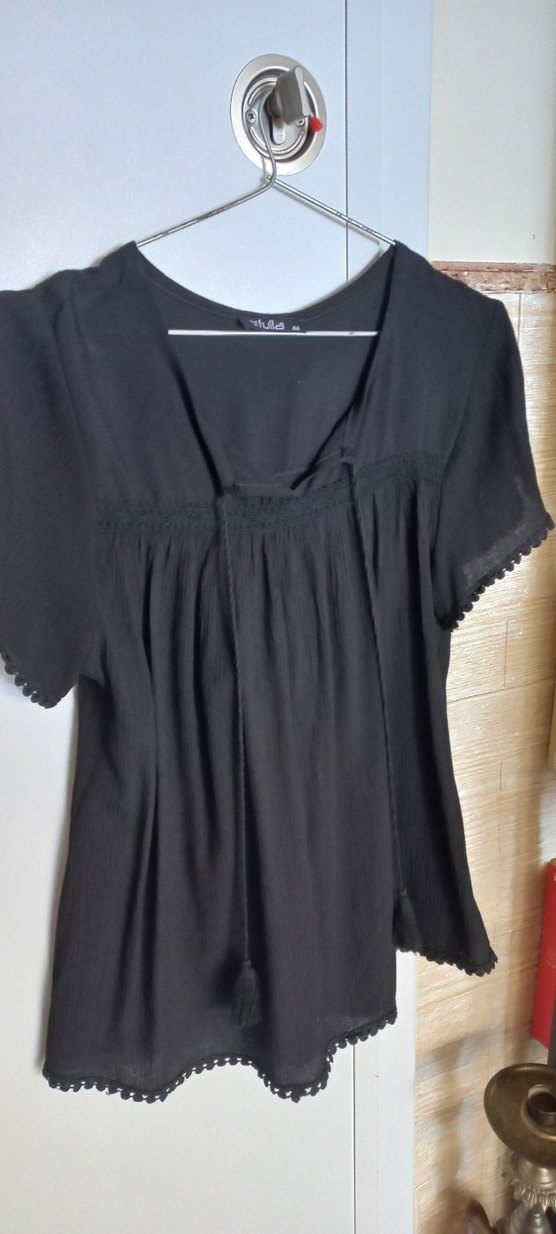 Siyah, bürumcuk, hamile bluzu, V yaka ve kısa kollu,dantel detaylı. Bol kesim ve bohem tarzıyla rahat bir kullanım sunar. ikj kol arası51 cm, omuzdzn boy 62 cm.