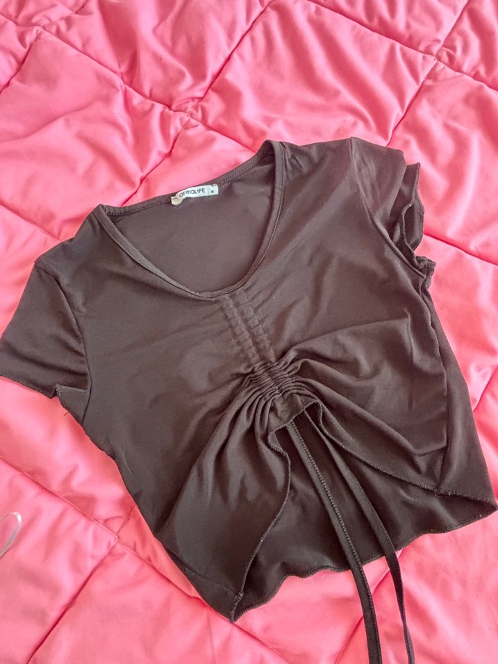 Bu kahverengi, büzgülü ve V yakalı crop top, ince kesimi ve askılı kollarıyla cesur goth tarzını kısa boyda sunar.