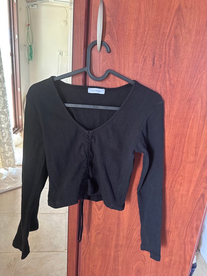 Yumuşak keten kumaştan, uzun kollu ve V yakalı, büzgülü ayarlanabilir ön detaylı siyah, fitted kesim bluz. Minimalist ve gotik tarzda, günlük kullanıma uygun. Çok rahat kumaştan önünü istediğiniz gibi büzüp ya da büzmeden kullanabilirsiniz. 1-2 kere giydim. Herhangi bir defosu yoktur. Standart beden ile çok rahat kullanımı var esnek kumaştan.