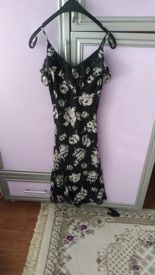 Siyah, çiçek desenli, V yakalı ve kolsuz, vücuda oturan midi elbise, fırfır detaylara sahiptir, romantik akşamlar için uygundur.