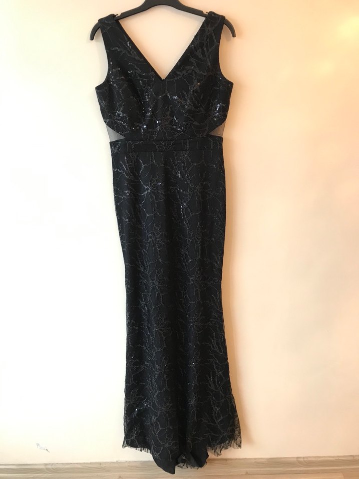 Siyah V Yaka Dantel Detaylı Uzun Abiye Elbise