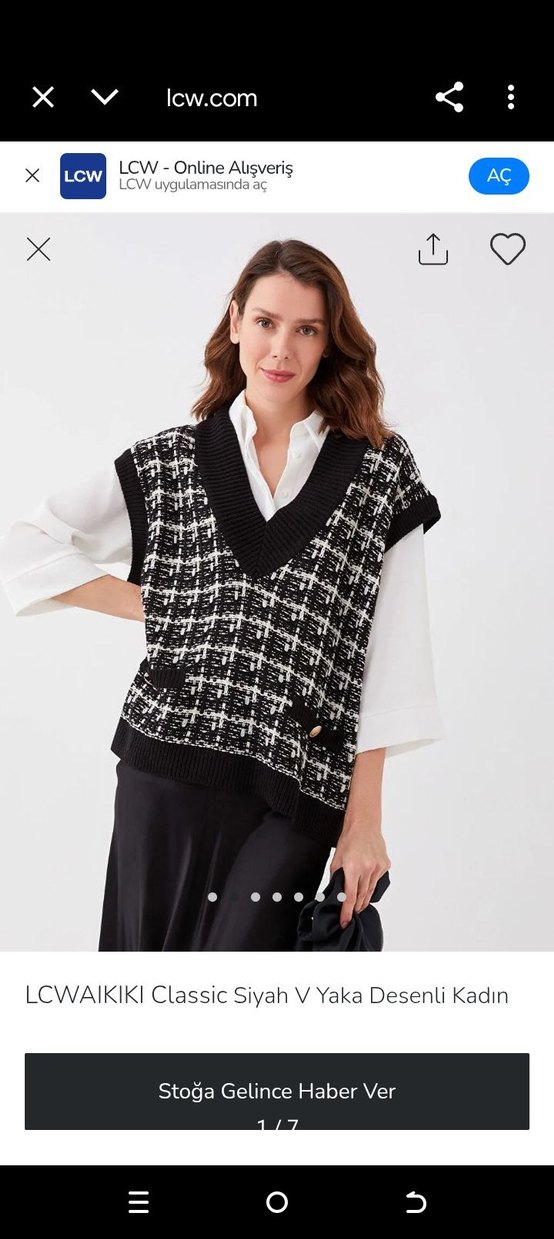Siyah renkli, V yakalı ve desenli örme kadın süveter. Rahat kesimi ve midi boyu ile ofis için uygun, kolsuz tasarıma sahiptir.