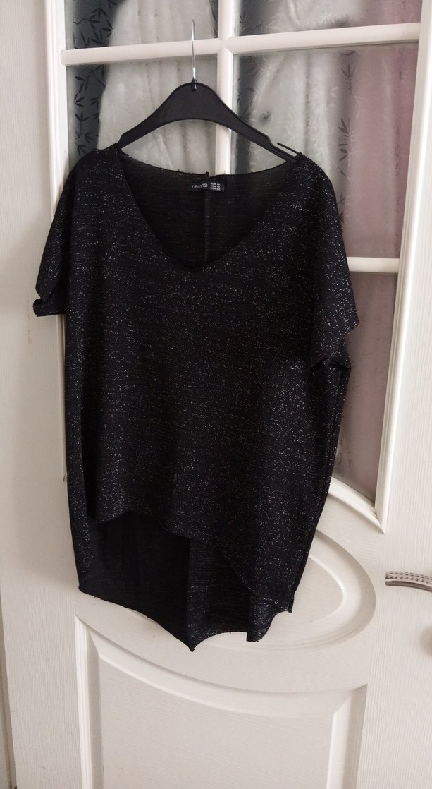 V yaka, kısa kollu, dökümlü ve kısa boylu siyah kadın bluz. Yumuşak sentetik kumaştan yapılmıştır, rahat günlük kullanım için uygundur.
