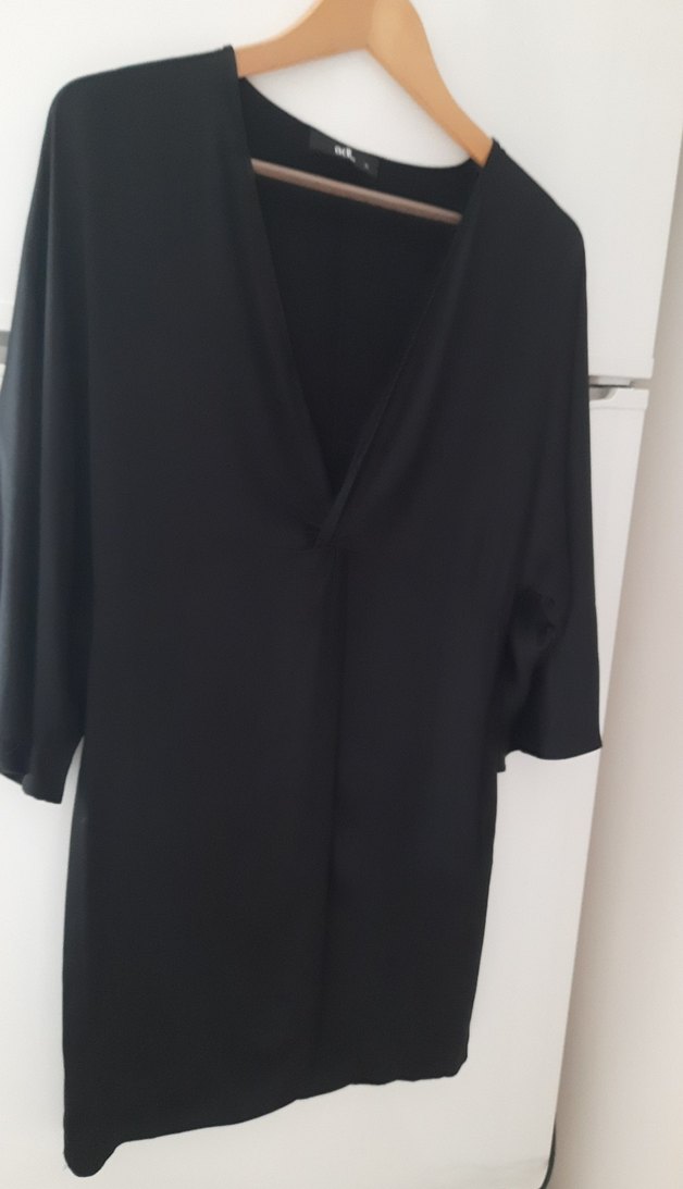 Siyah, dökümlü ve V yaka olan bu kadın bluz, kısa kollu ve uzun boyludur. İpeksi dokusu ile ofis stiline uygundur.