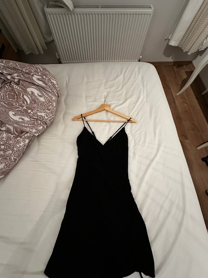 İnce askılı, V yakalı ve drapeli, ketenimsi kumaş ayarlamalı siyah elbise. M beden