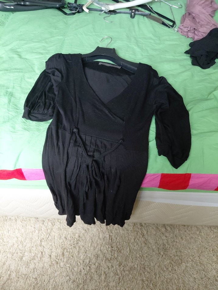 Siyah, V yakalı ve uzun kollu elbise, Drapeli tasarımı ve midi boyu ile sentetik kumaştan üretilmiştir.