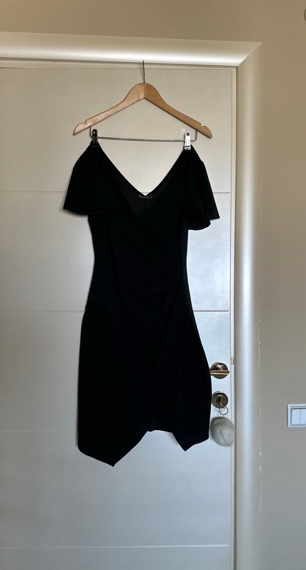 V yakakarın kısmı drapeli detaylı hareketli kol detaylı , asimetrik etekli diz üstü hiç kullanılmamış yeni elbise, romantik akşamlar için uygun. Fitted kesimi ve sade tasarımıyla avant-garde ve Parisian goth tarzına uyum sağlayan her gardropta olaması gereken çok şık bir siyah elbise