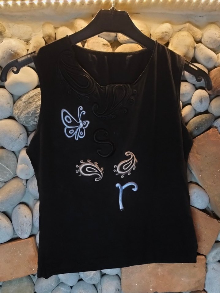 Siyah, V yaka, kolsuz ve drapeli kısa üst. Gotik desenler baskılı, sentetik kumaştan, günlük kullanıma uygun. Marka temsili.