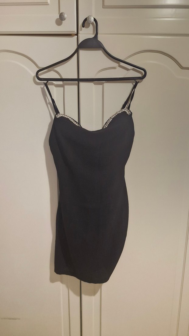 Siyah, ince askılı ve V yakalı bu dar kesim midi elbise, drapeli detaylara sahip. Cesur gotik tarzıyla romantik akşamlar için uygun.