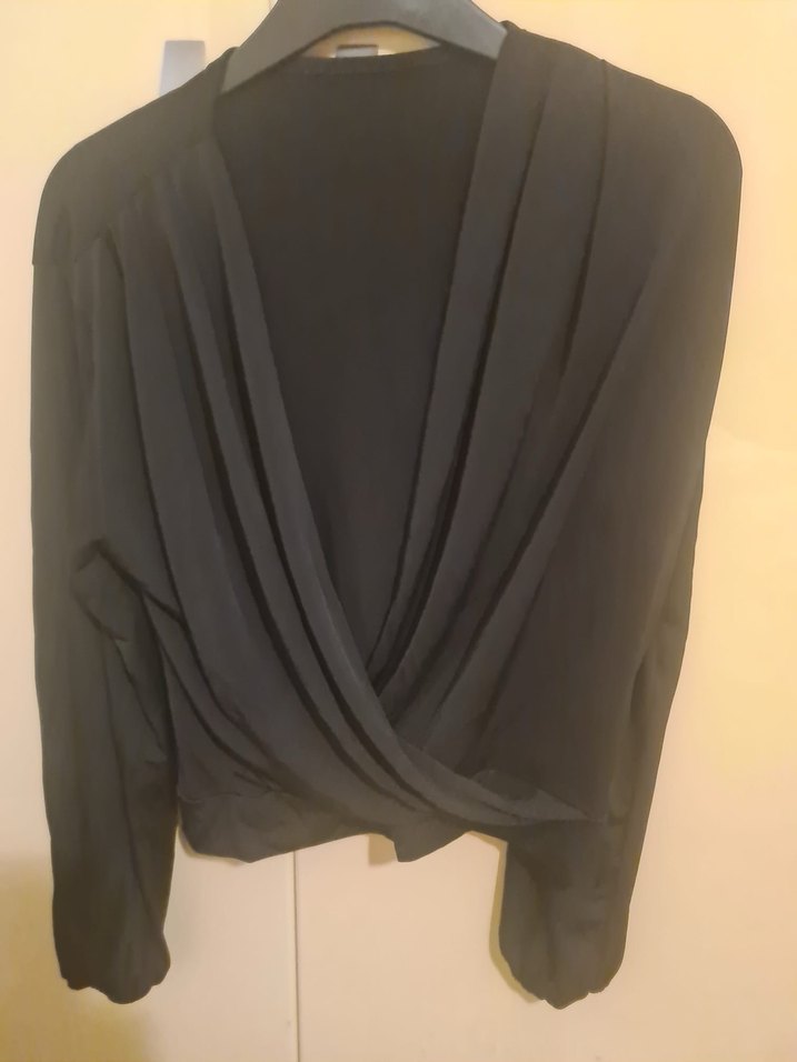 Siyah renkte, V yaka ve uzun kollu, drapeli ve vücuda oturan kesime sahip kadın bluz. İpeksi kumaştan, minimalist goth tarzında, ofis kullanımı için uygun.