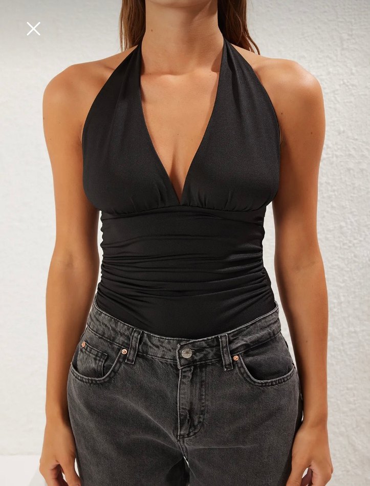 V yaka ve kolsuz tasarıma sahip, drapeli ve vücuda oturan siyah denim kadın büstiyer. Günlük kullanıma uygun, salaş sokak stili midi uzunlukta, desensiz ve siyah tonlarında.