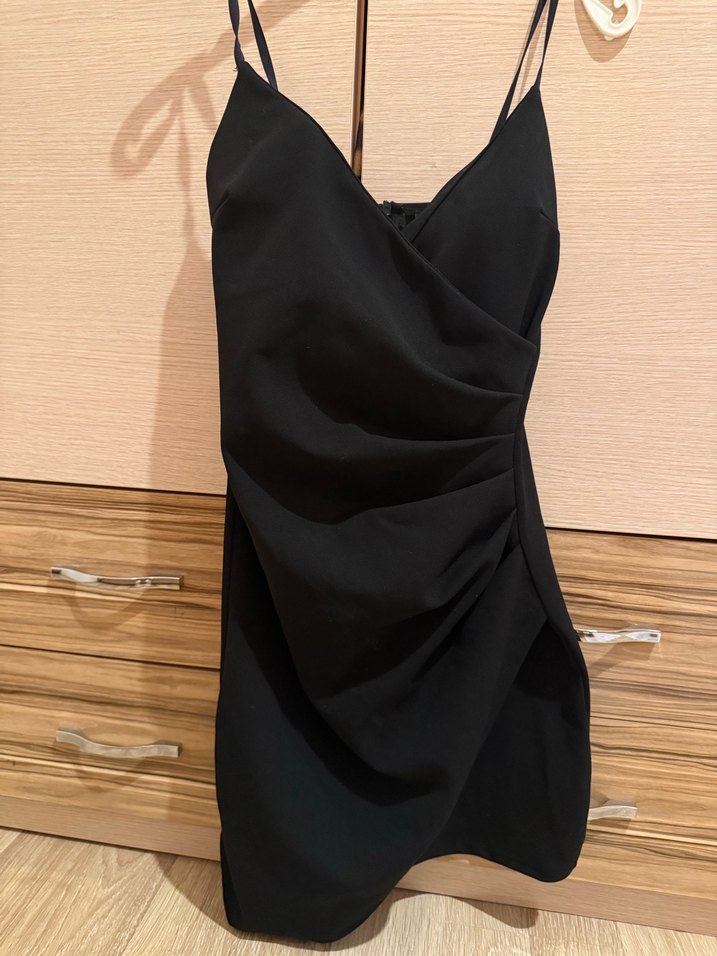 Siyah midi elbise, V yaka ve ince askılarla tasarlanmıştır. Drapeli kesimi cesur ve minimalist bir stil sunar, romantik akşamlar için uygundur.