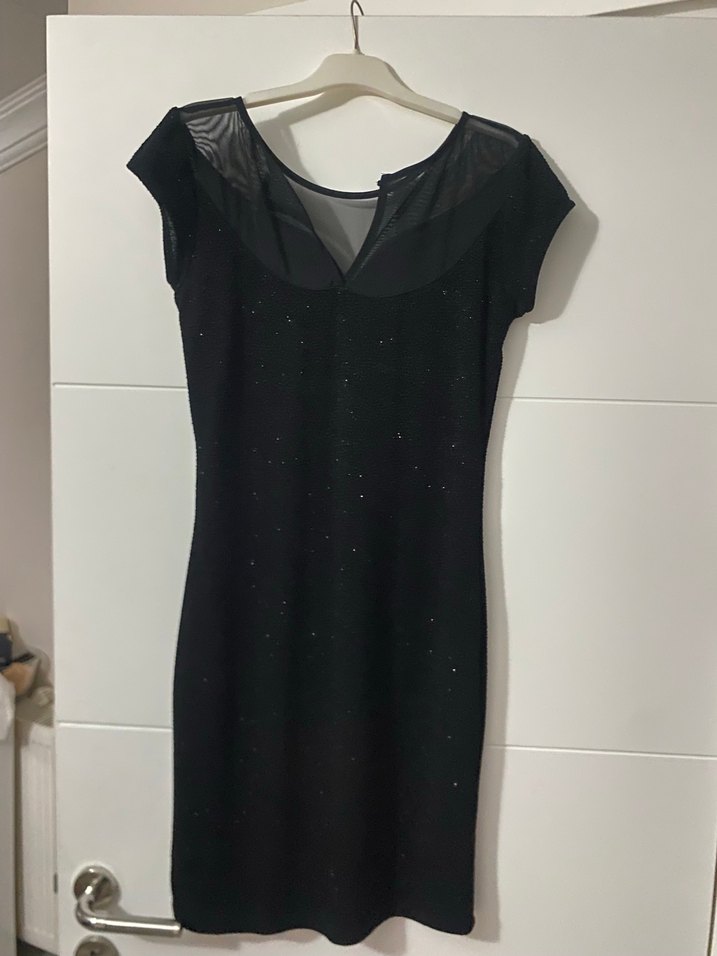 V yaka ve drapeli detaylara sahip, transparan üst kısmı bulunan siyah, vücuda oturan midi elbise. Gotik tarzda, romantik akşamlar için uygundur.