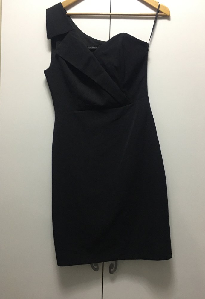 Siyah midi elbise, drapeli detay ve V yakaya sahiptir. Kolsuz, fit kesim ve minimalist gotik tarzıyla ofis için uygundur.