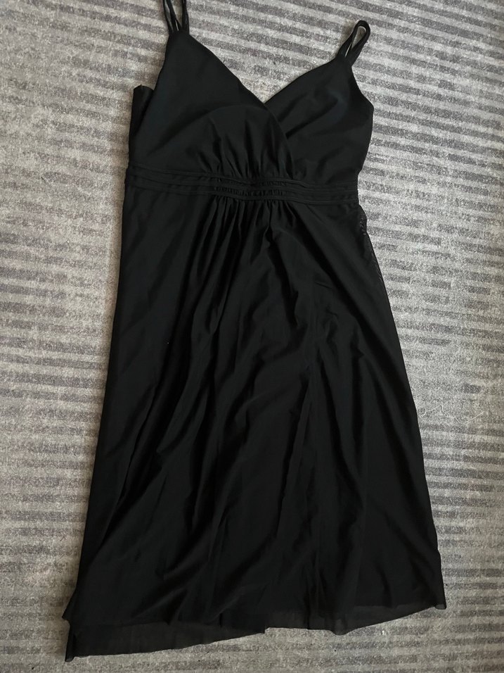 Siyah midi elbise, V yaka ve ince askılıdır.