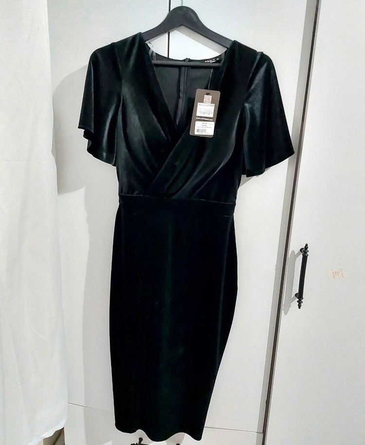 Bu siyah midi elbise, drapeli V yaka ve kısa kollu olup klasik zarafet ile gotik tarzı ofis şıklığıyla birleştirir.