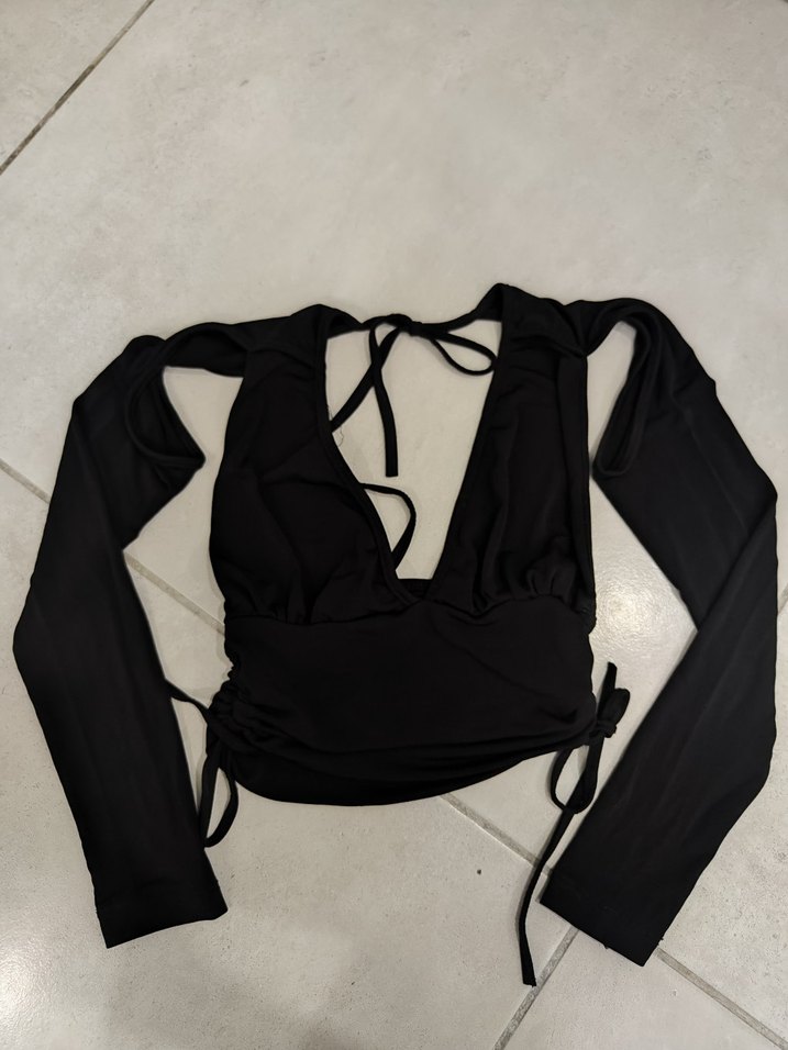 Siyah, v yakalı ve drapeli uzun kollu, dar kesim kadın bluz. Pürüzsüz sentetik kumaştan üretilmiş, cesur bir görünüm sunar. dekolteli crop bluz boynu ve bel kısmı ayarlanabilir