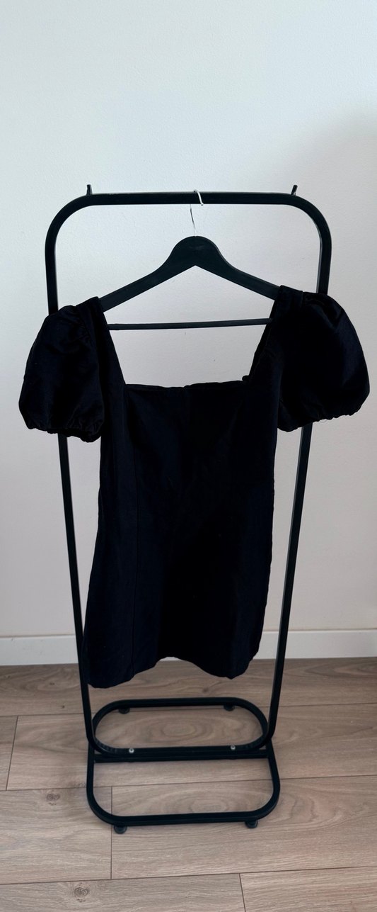 Yumuşak keten kumaştan siyah, v yaka, drapeli ve balon kollu mini elbise. Minimalist gotik tarz için uygundur.