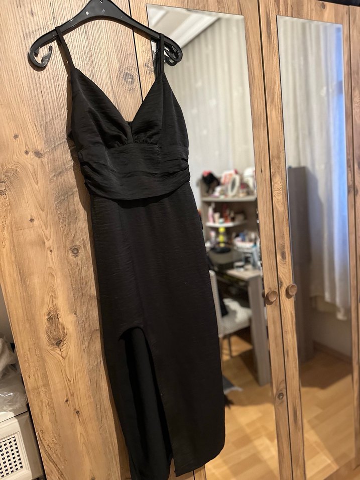 V yakalı, askılı ve drapeli detaylara sahip siyah uzun abiye elbise, romantik akşamlar için şık ve fit kesimle tasarlandı.