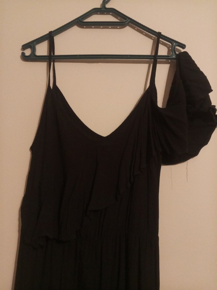 Siyah uzun elbise, V yaka ve drapeli detaylara sahip. İp askılı, ipeksi kumaştan, bol kesim ve minimalist gotik tarzda günlük kullanıma uygun.