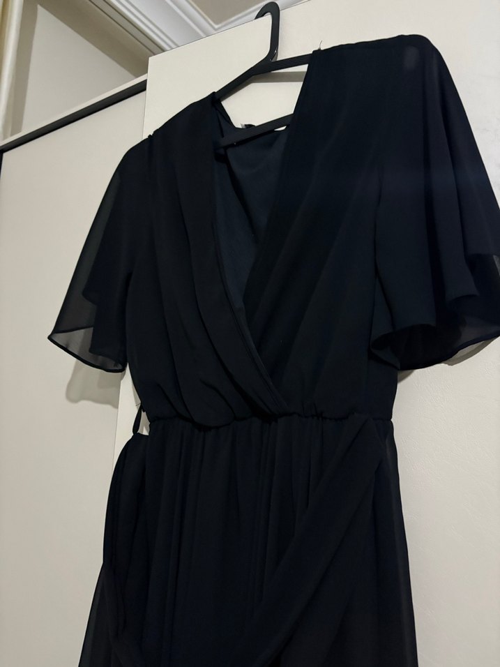 Siyah, v yaka ve drapeli uzun elbise, salaş kesim ve askılı kollarla, ipeksi dokuda, ofis için uygun. 1 sefer giyildi