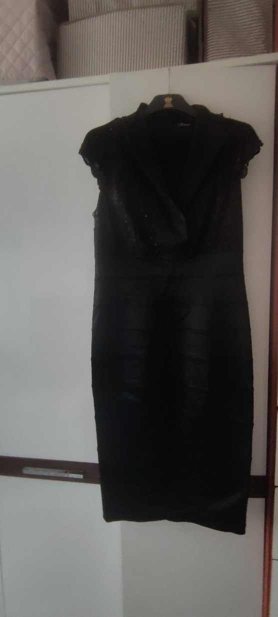 Siyah, v yaka, drapeli ve kolsuz uzun elbise, gotik ve avangart tarz için uygun, vücuda oturan kesimle.