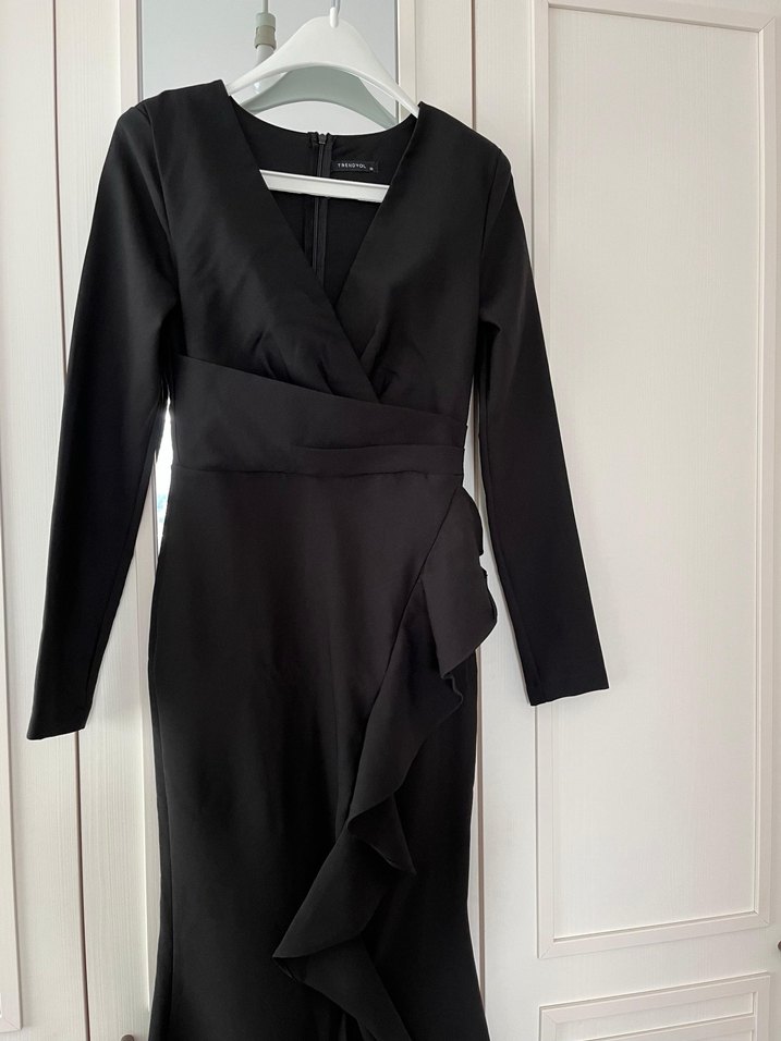 Siyah renkte, V yaka ve drapeli detaylı uzun elbise. Dar kesim, uzun kollu ve modern klasik tarzda, ofis kullanımı için uygundur. Desensiz ve şık.