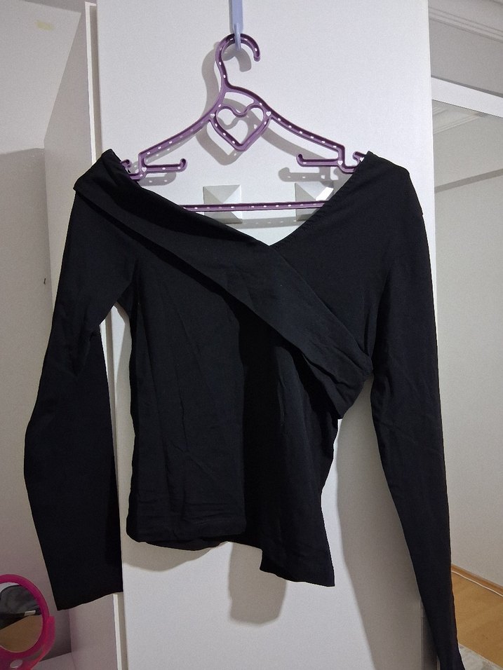 V yaka ve uzun kollu, drapeli detaylı siyah bluz. Sentetik kumaştan, midi boyda, gotik ve avangart tarzlara uygun. ölçüleri fotoğraflarda belirtilmiştir.
