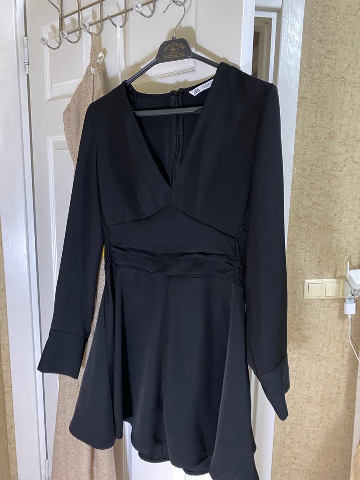 V yaka ve drapeli detaylara sahip, siyah, uzun kollu ve vücuda oturan midi elbise. Gotik tarzıyla ofis için uygun. skater krep elbise diye geciyo gecen sene 1600e aldim hic giymedim sadece etiketini cikardim sorunsuz tertemiz s beden ama m bedene de oluyor gobegi gizliyor beli incecik gosteriyor çok şık ve iddiali bir elbise boyu cok cok mini degil ama kisa gogus dekoltesi var kollari dugmeli ister acip kivirin isterseniz boyle kullanin