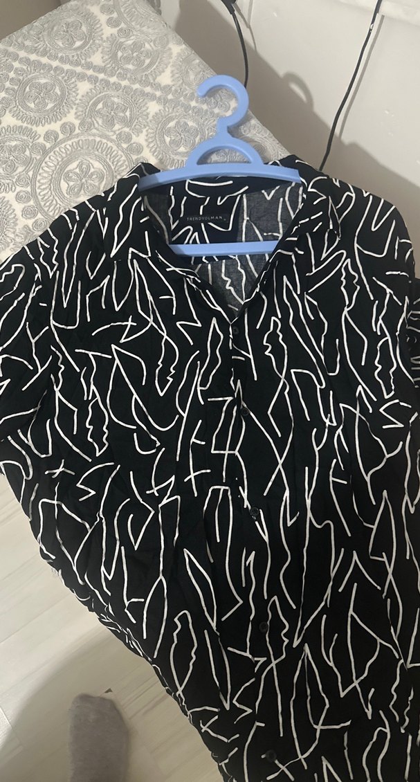 Erkekler için bol kesim, kısa kollu, V yakalı ve düğmeli ön detaylı siyah beyaz gömlek. Beyaz soyut çizgi desenli, uzun kesim ve sentetik kumaştan üretilmiştir. Sokak stili için uygun.