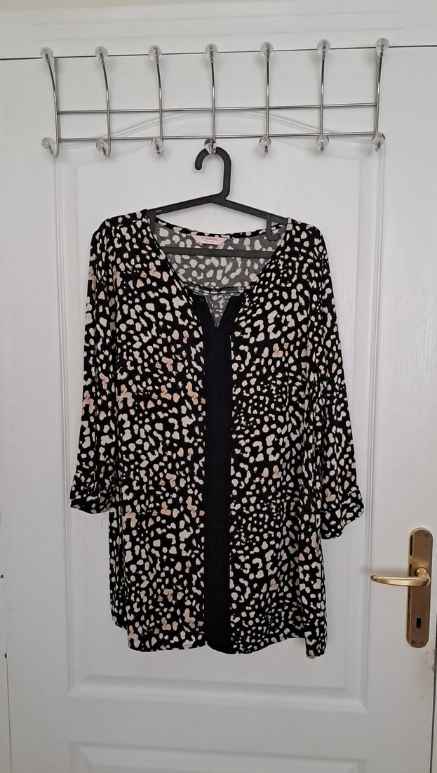 Siyah, düğmeli ön detaylı, V yaka ve uzun kollu, bol kesim kadın bluz. Yumuşak sentetik kumaştan, günlük kullanıma uygun.