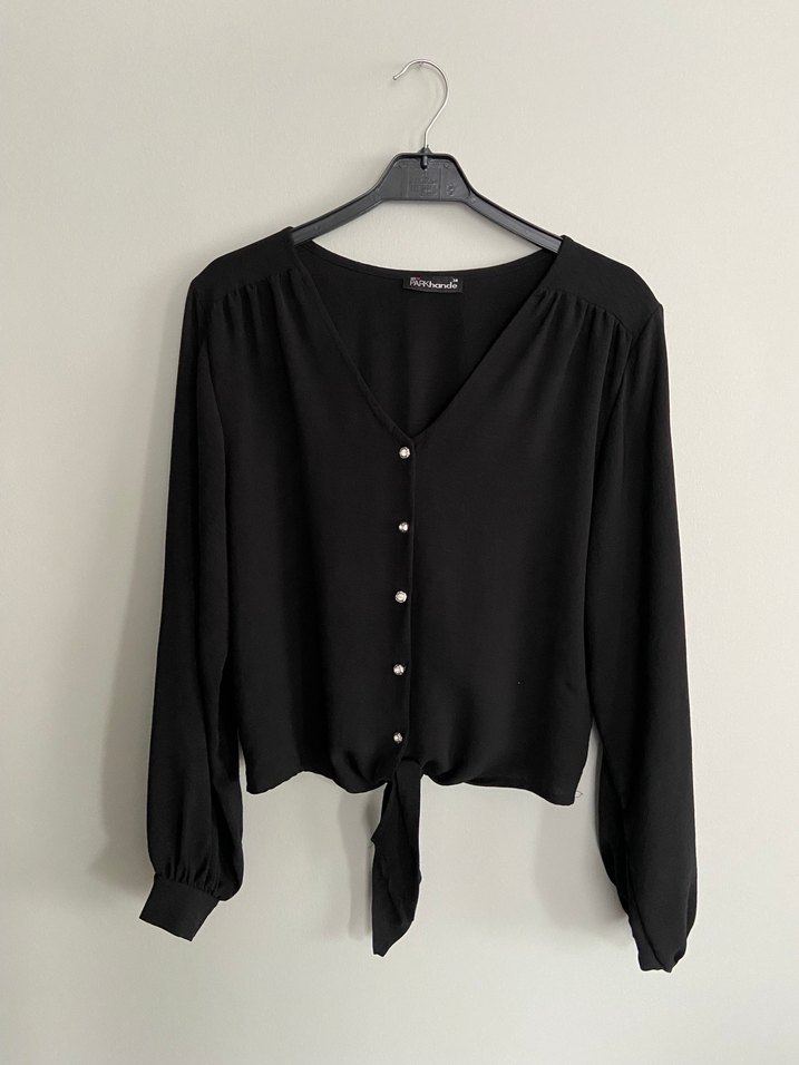 Siyah, uzun kollu, V yakalı ve bol kesim bu bluz ipeksi kumaştan üretilmiştir. Önde düğmeli ve uç kısmında bağlama detayı vardır. Günlük kullanıma uygundur. Düğmeler taşlıdır