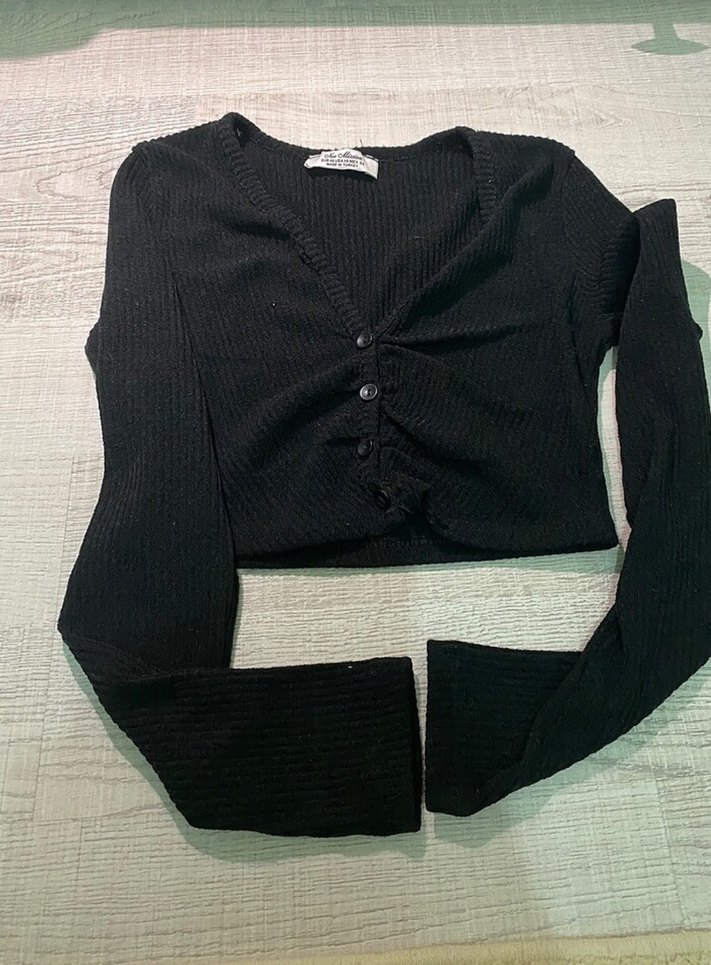 Siyah triko kumaştan, v yaka ve düğmeli, uzun kollu, normal boyda, rahat goth tarzı kadın bluz.
