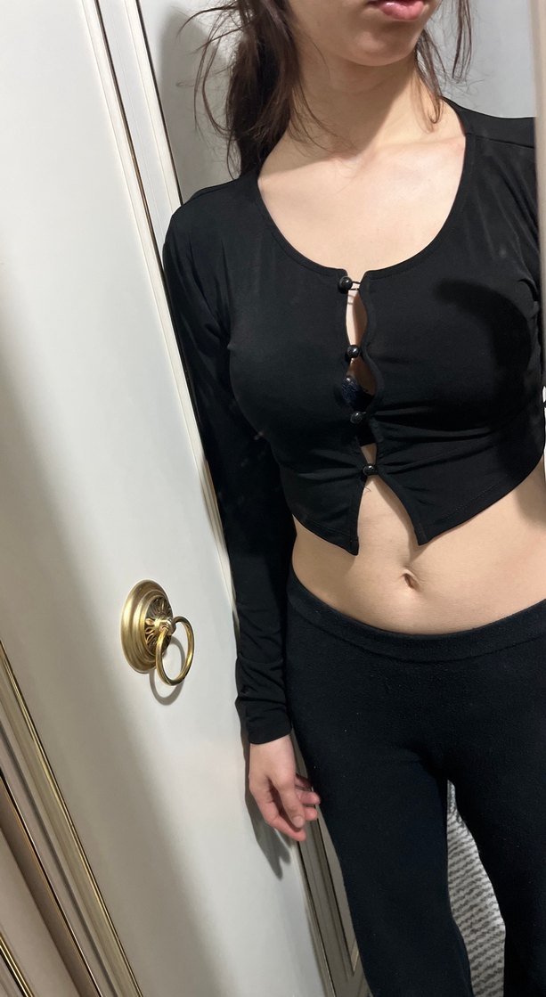 Siyah, ipeksi kumaştan, düğmeli ön kapamalı, V yaka ve uzun kollu, fitted kesim kız bolero. Cesur goth tarzına sahip.