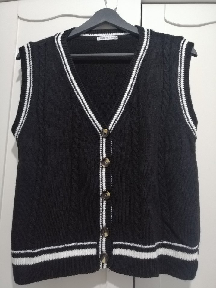 Siyah, örgü kumaştan yapılmış, düğmeli ve V yaka detaylı, kolsuz, fitted kesim süveter. Beyaz şeritlerle süslenmiş, günlük ve sokak stiline uygun. beden standart. Yeni hiç kullanılmadı