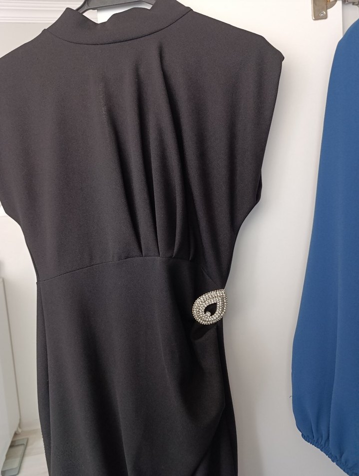 V yaka, düğmeli, siyah ve uzun kesimli bu dar kesim abiye elbise, minimal goth tarzını yansıtarak romantik akşamlar için uygun.