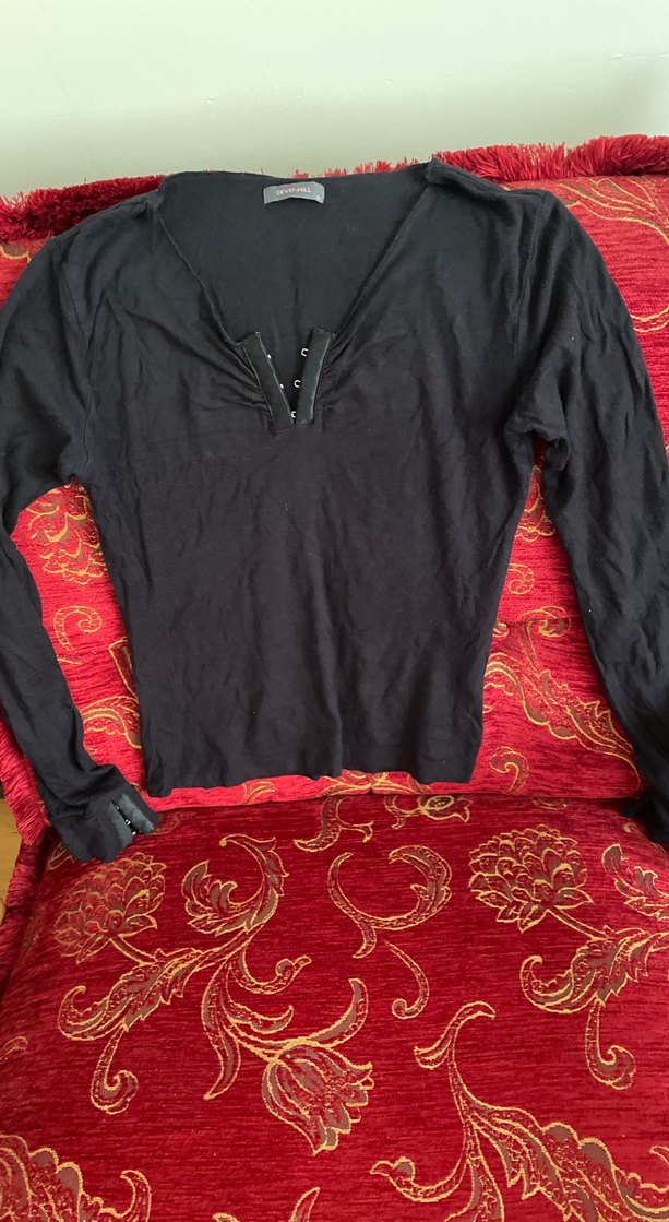 Siyah, v yaka ve düğmeli detaylı, uzun kollu, dar kesim gotik bluz. Yumuşak sentetik kumaştan, günlük kullanıma uygun.