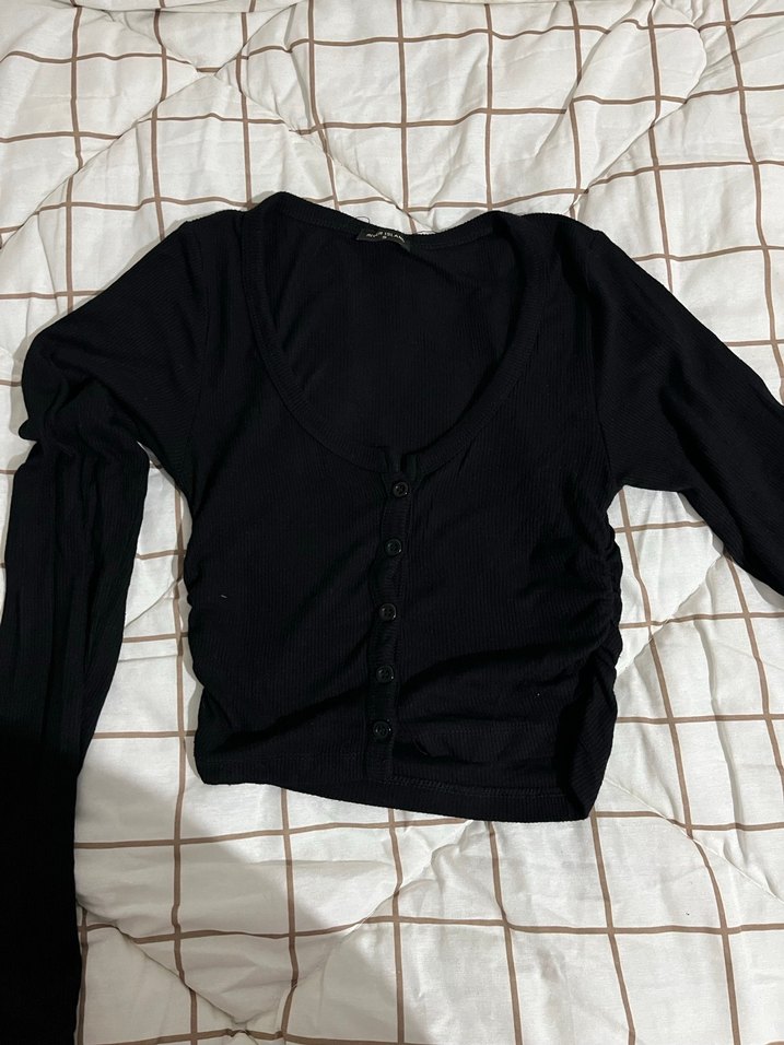 Siyah V Yaka Düğmeli Uzun Kollu İnce crop