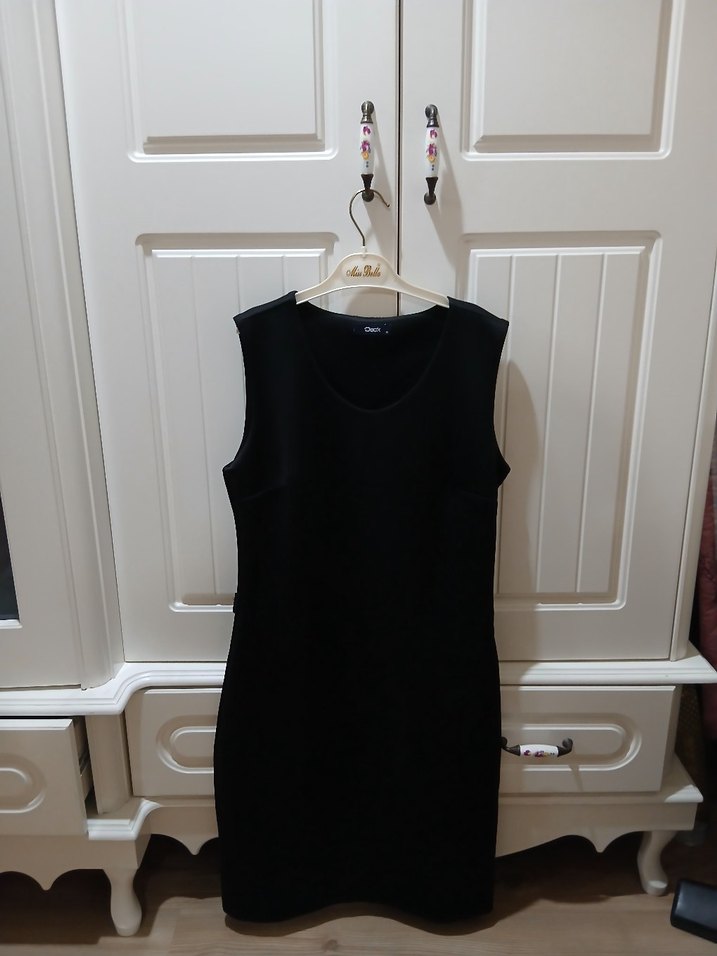 Siyah, koloksuz, V yakalı, vücuda oturan elbise. Günlük kullanıma uygun, yumuşak sentetik kumaştan üretilmiştir.