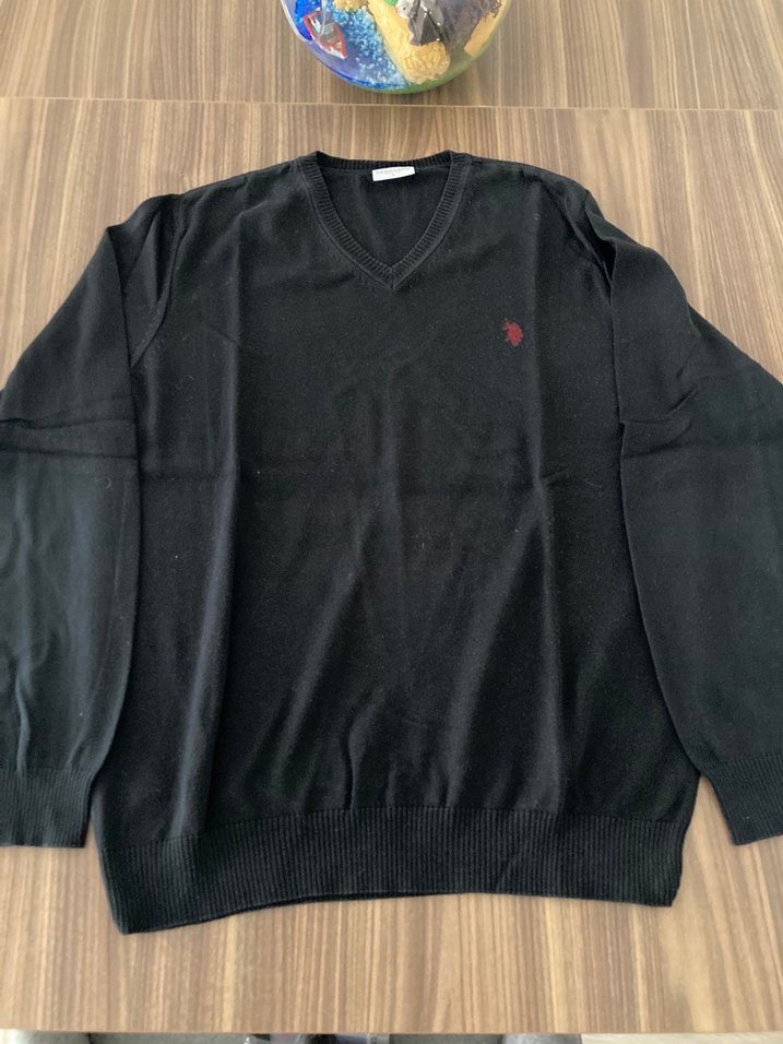 Siyah, uzun kollu, V yaka, bol kesim erkek triko kazak. Yumuşak ve sıcak kumaştan, desensiz sade tasarım. Günlük sokak stili için uygundur.