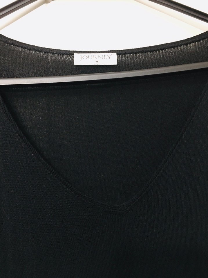 Siyah, V yaka ve kolsuz tasarıma sahip, fermuarlı ve ince dokulu hamile bluzu. Minimalist ve şık görünüm sunar, günlük kullanıma uygundur. Journey markalı.