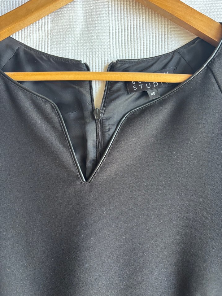 Siyah, v yaka ve fermuarlı çok şık elbise. Pürüzsüz tok bi kumaştan, askılı kollu ve midi boyda, ofis için uygun. Yakası kolu ve beli deri biyeli