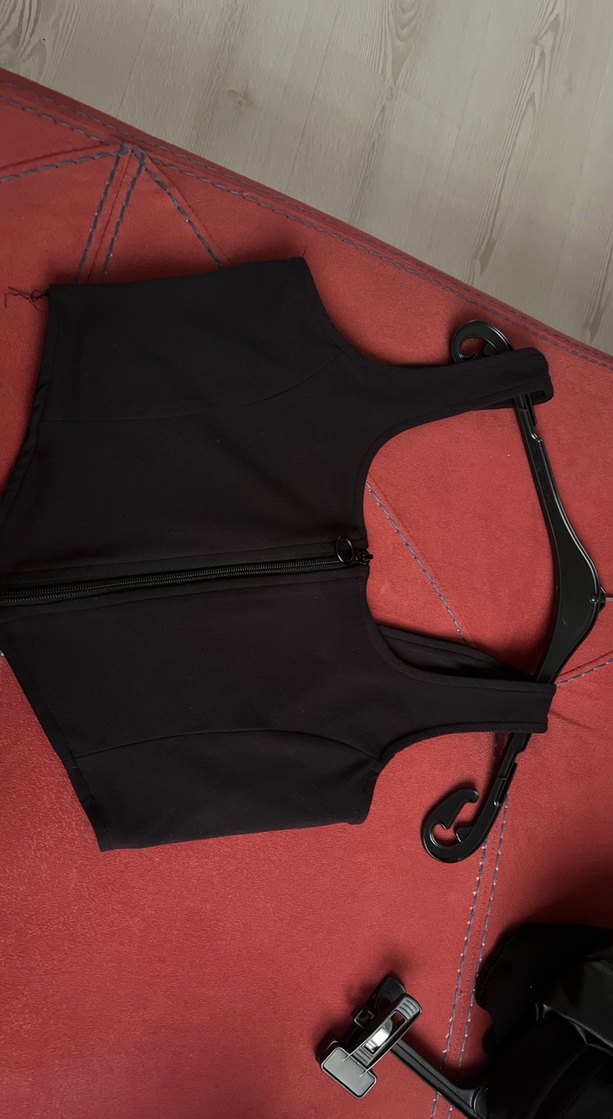 Siyah, V yakalı ve ön fermuarlı bu fitted büstiyer, sentetik kumaştan yapılmıştır. Kolsuz ve mini boyda, gotik tarzda günlük kullanıma uygundur.