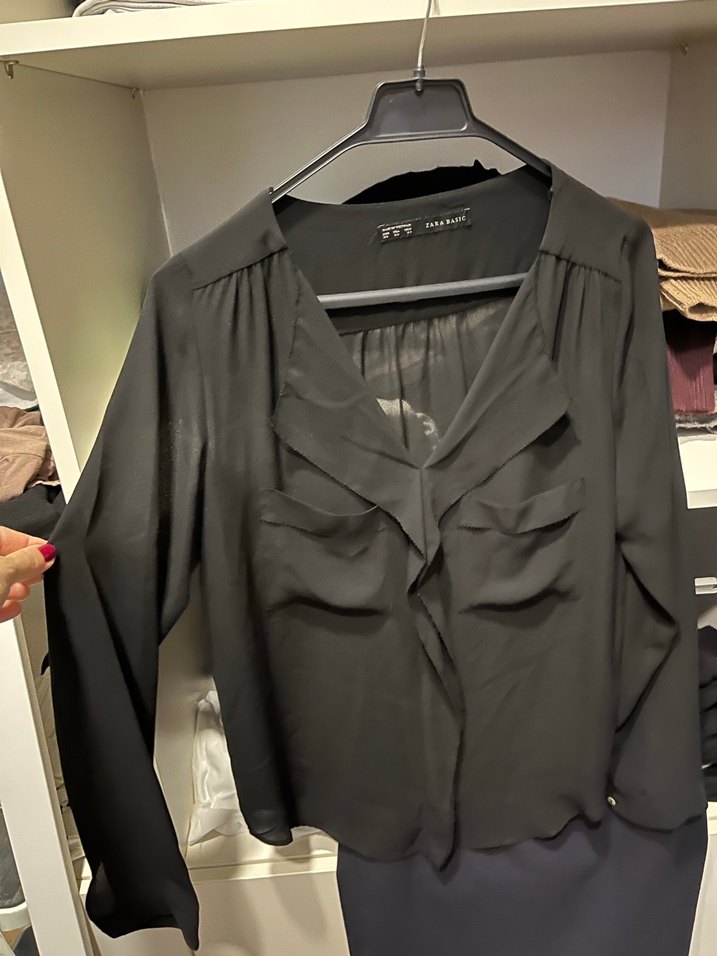 Siyah, V yakalı, uzun kollu kadın gömlek. İpek dokulu kumaş, fırfır detaylı ve midi boyda. Ofis için uygun, trend goth tarzda.