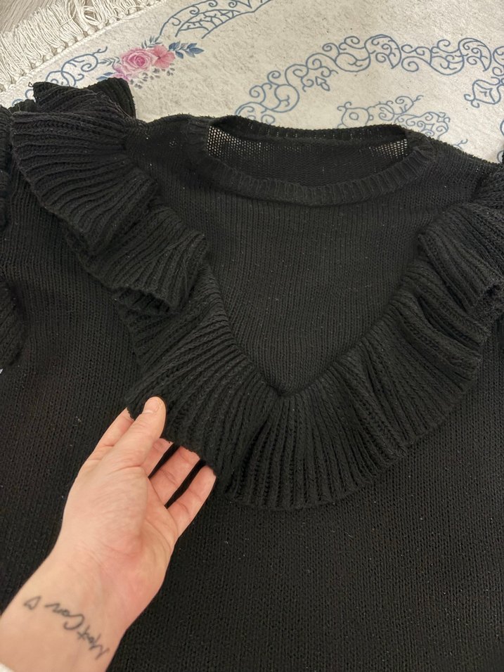 Siyah renkte, V yaka ve fırfır detaylı, uzun kollu, bol kesim triko kazak. Günlük kullanıma uygun, gotik ve rahat tarzda.