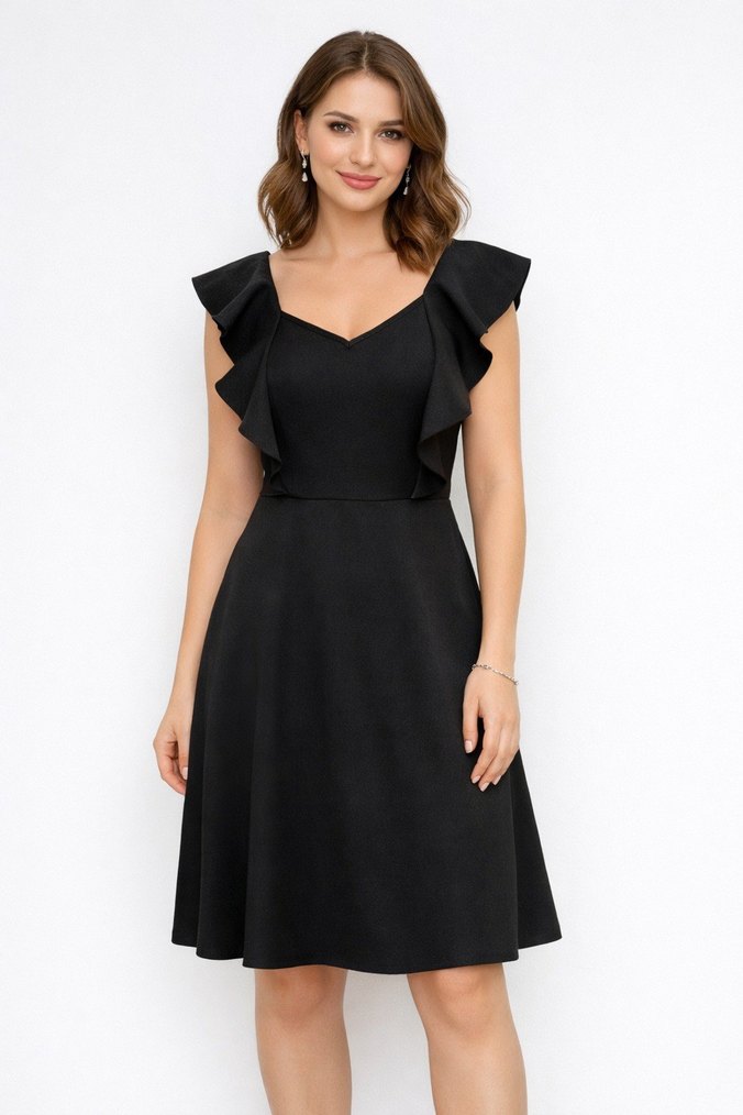 Siyah midi elbise, V yaka ve fırfırlı kolsuz tasarıma sahip, parlak görünümlü ve normal kesimdir. Cesur ofis stilleri için uygundur.