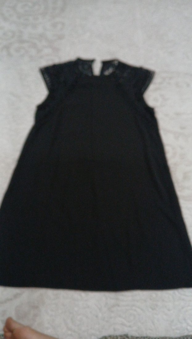 Siyah renkte, V yakalı ve kolsuz, fırfırlı detaylara sahip midi boy bol kesim elbisedir.