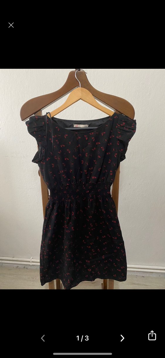 Siyah renkli, V yakalı ve fırfırlı detaylara sahip midi boy, vücuda oturan elbise. Sentetik kumaştan, koyu tonlarda batik desenlidir. Romantik akşamlar için uygundur.