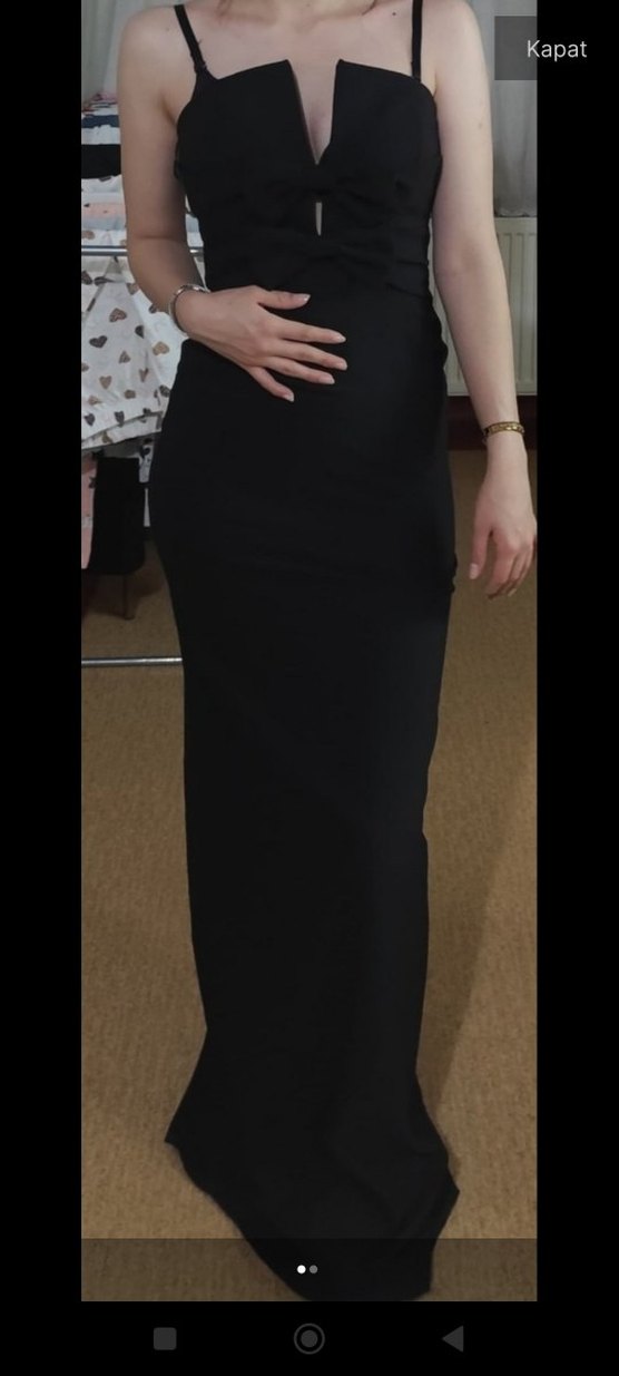 Siyah, V yakalı, drapeli elbise, ofis için goth tarzıyla uyumludur. hic giyilmedi aşırı güzel temiz sorunsuz straplez