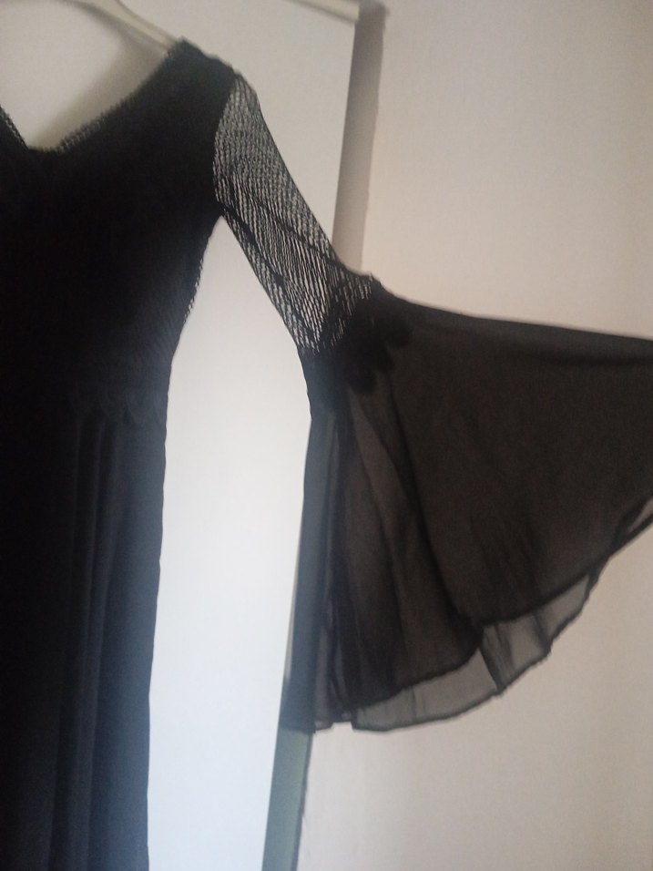 Siyah, v yaka ve drapeli,file dantelli şifon etek astarlı olan gotik tarzda, normal kısa boy ve kesim abiye elbise. Desensiz ve parti için uygun.